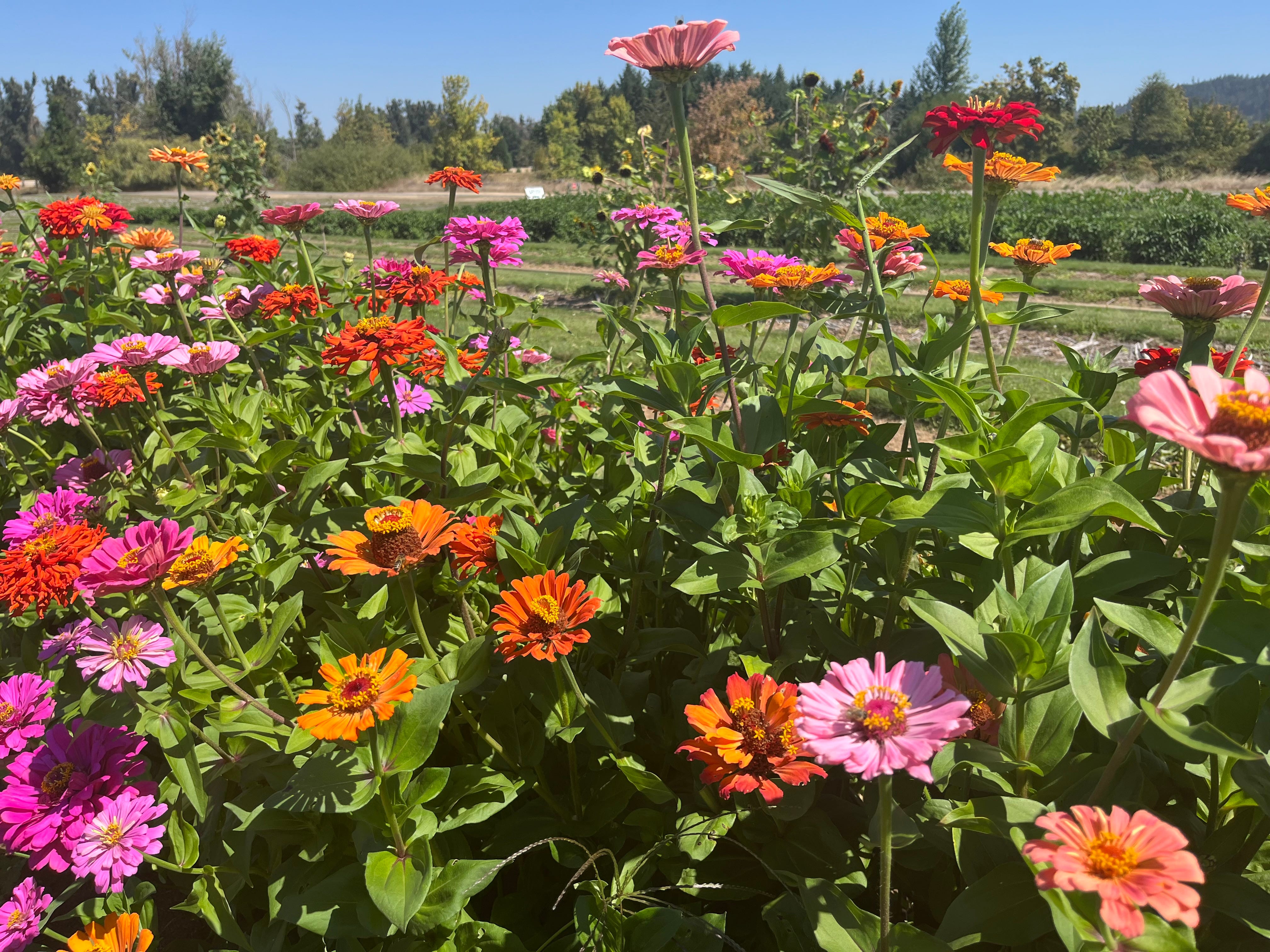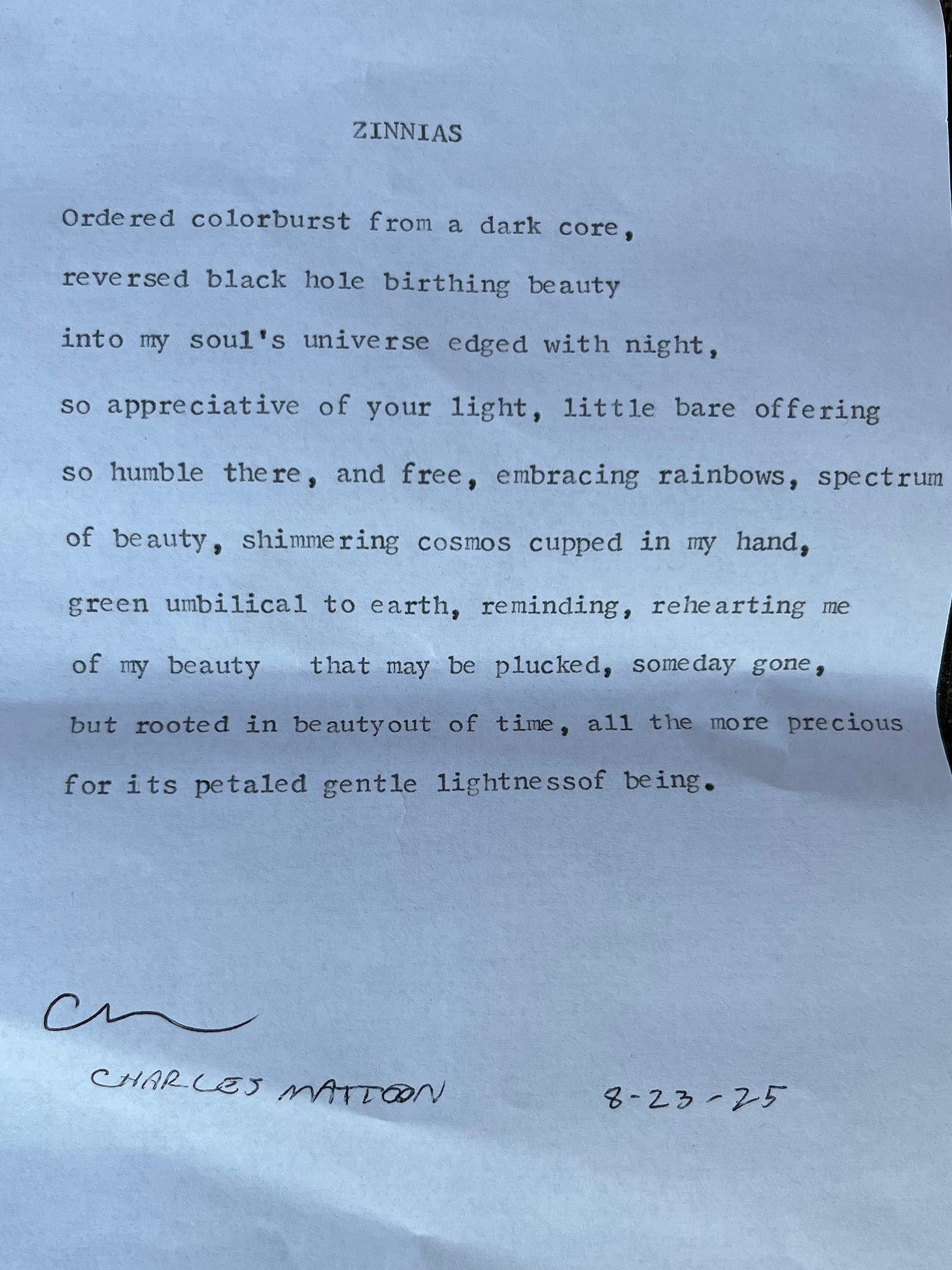We did a democrat coffeehouse in Cottage Grove and since I was there early I walked around in the farmer’s market. There was a booth with poets offering to write poems so I asked for one and they said what is the subject and I said “zinnias” before thinking about it. So a couple hours later, I picked up the poem, typed onto a bit of paper.